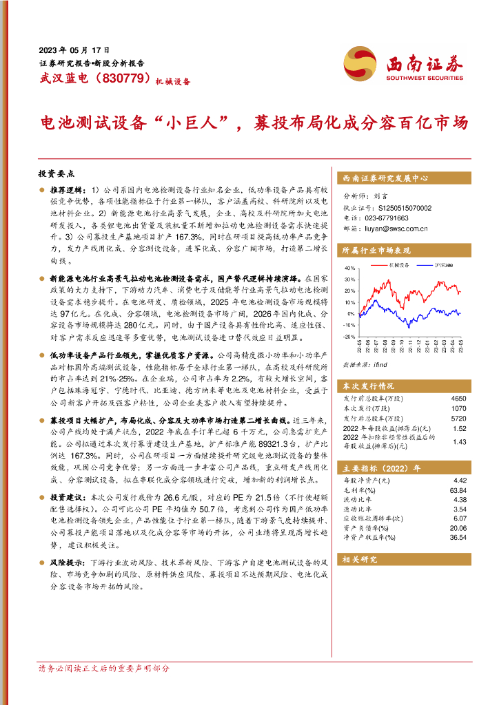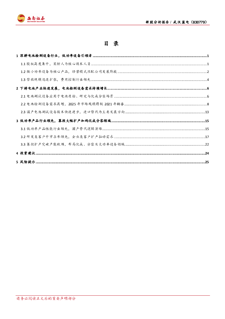 西南证券:武汉蓝电(830779)-电池测试设备“小巨人”,募投布局化成分容百亿市场.pdf