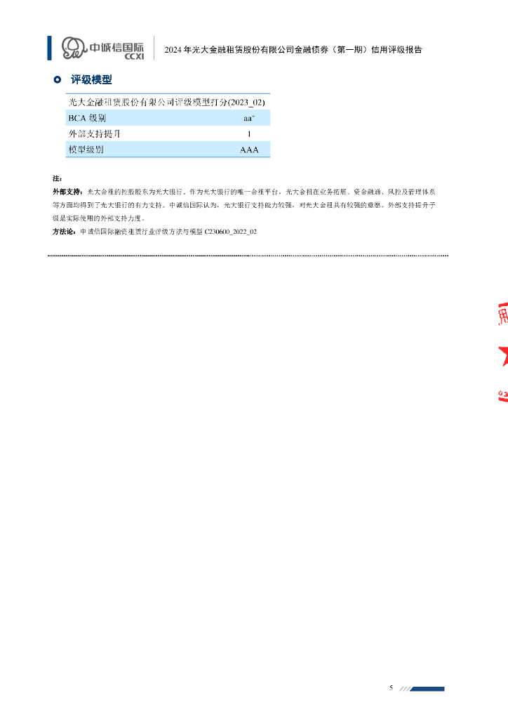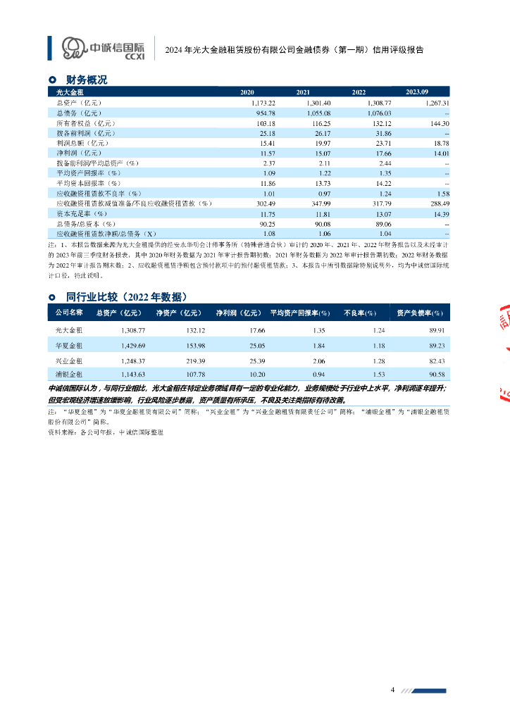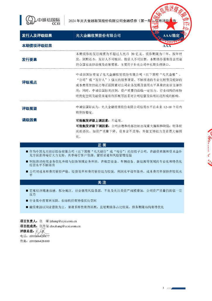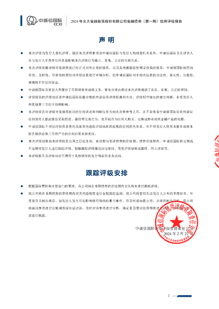 中诚信:2024年光大金融租赁股份有限公司金融债券(第一期)信用评级报告及跟踪评级安排.pdf