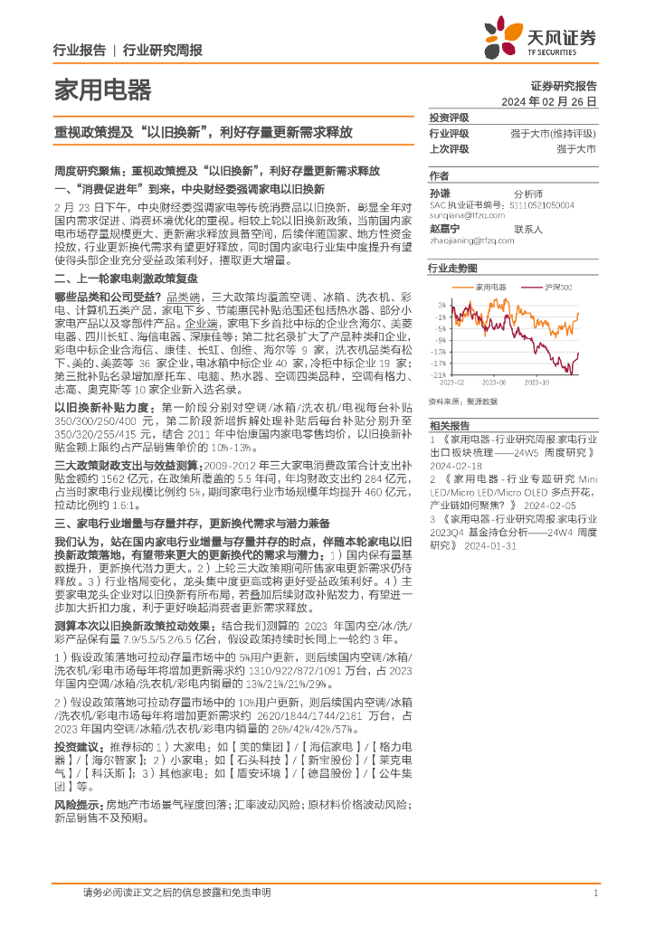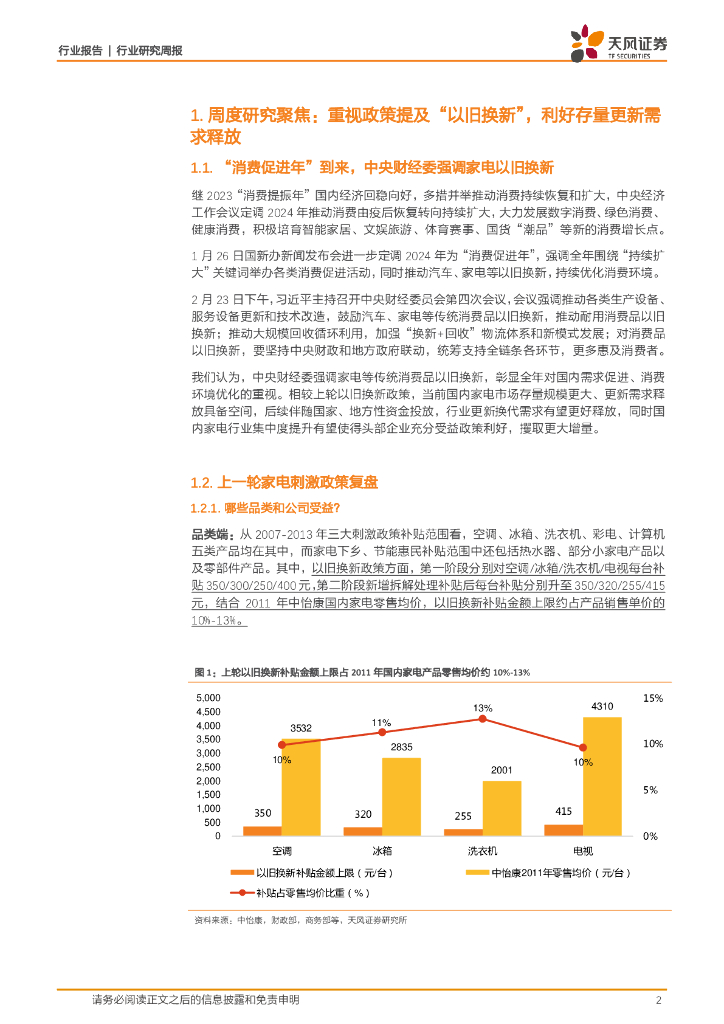 天风证券:家用电器行业研究周报:重视政策提及“以旧换新”,利好存量更新需求释放.pdf