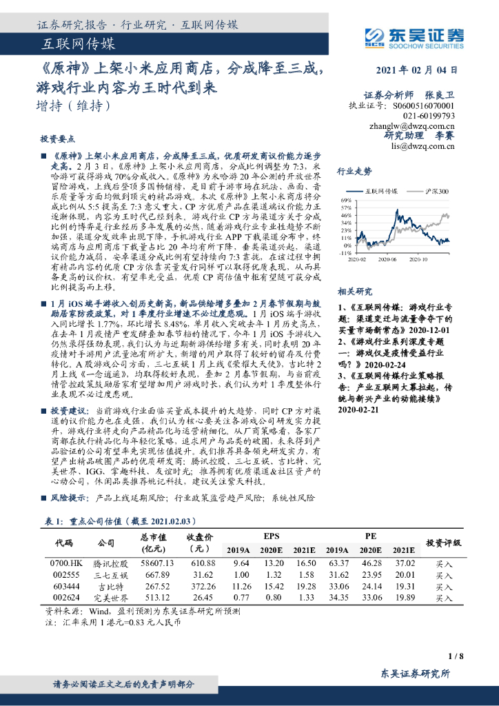 东吴证券:互联网传媒:《原神》上架小米应用商店,分成降至三成,游戏行业内容为王时代到来.pdf