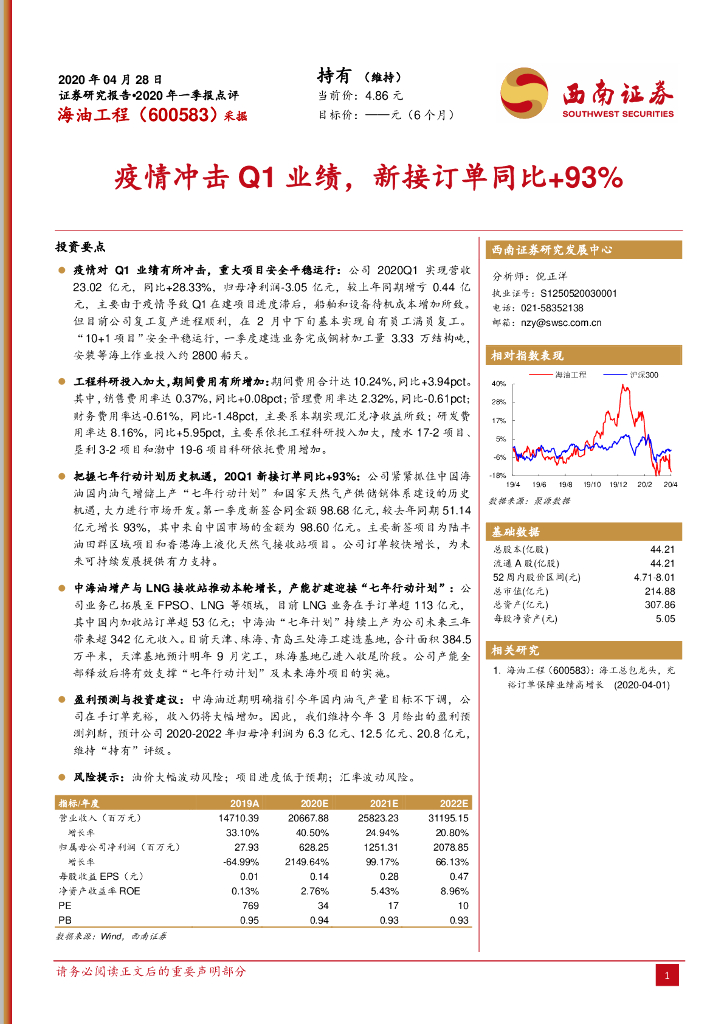 西南证券:海油工程(600583)-疫情冲击Q1业绩,新接订单同比+93%.pdf