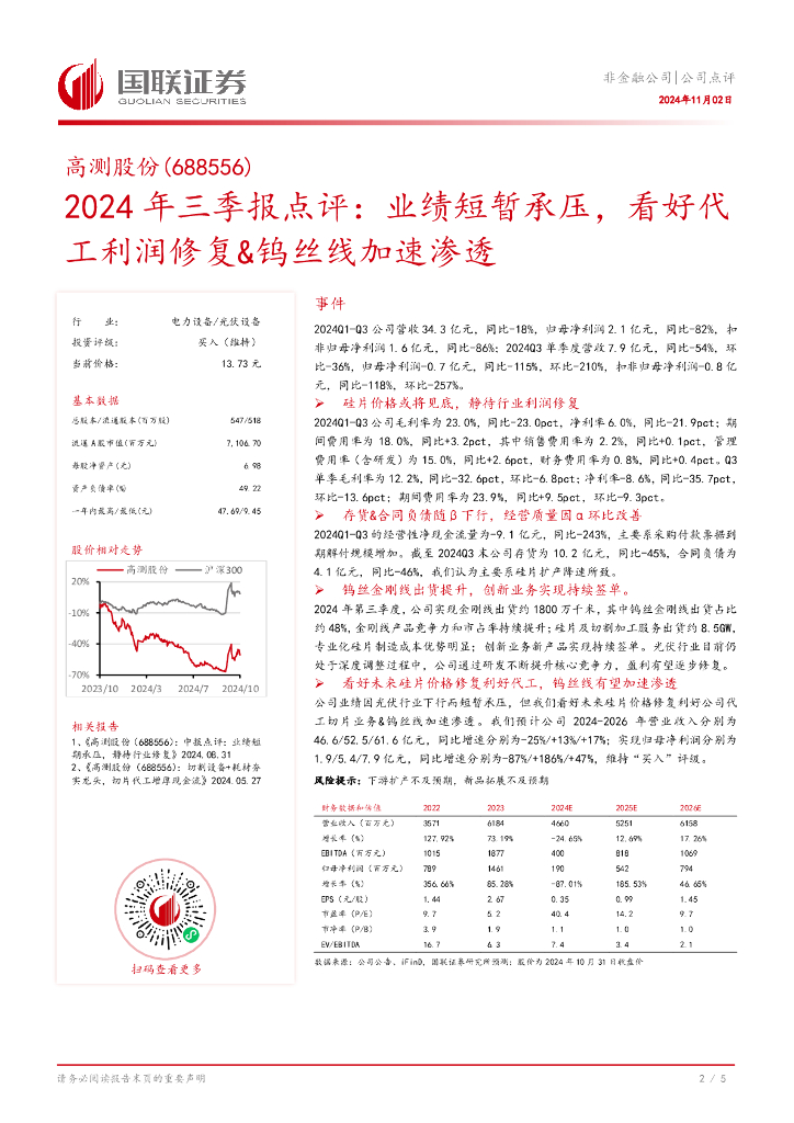 国联证券:高测股份(688556)-2024年三季报点评:业绩短暂承压,看好代工利润修复&钨丝线加速渗透.pdf