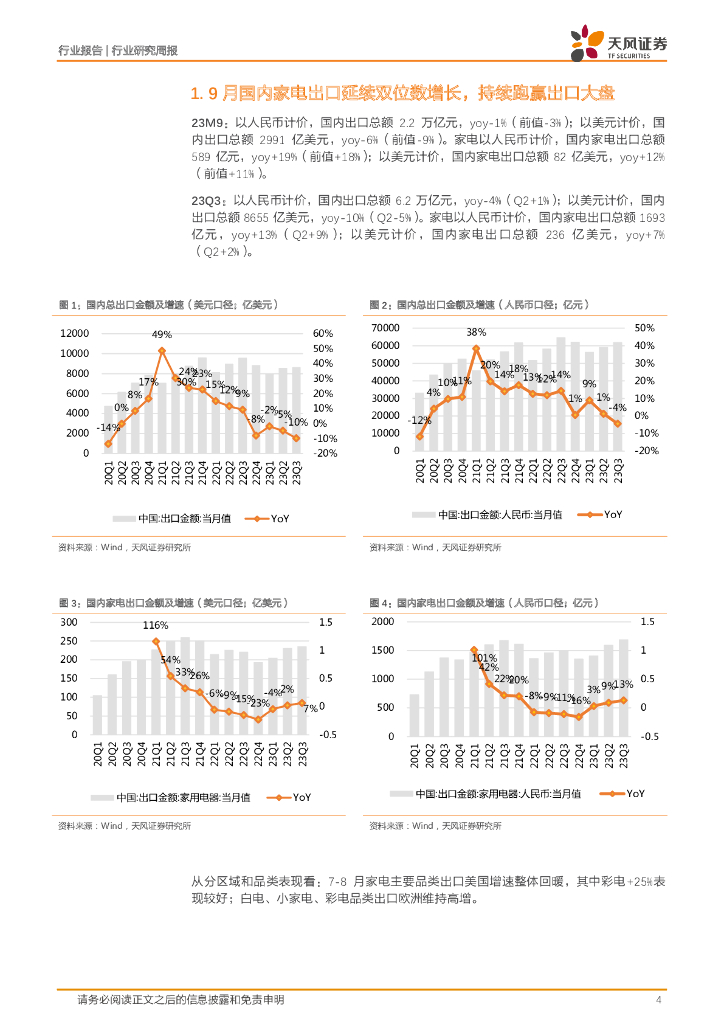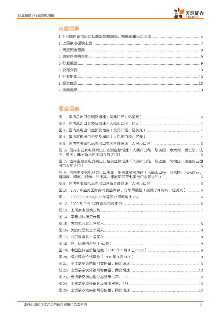 天风证券:家用电器23W42周度研究:9月家电出口双位数增长,持续跑赢出口大盘.pdf