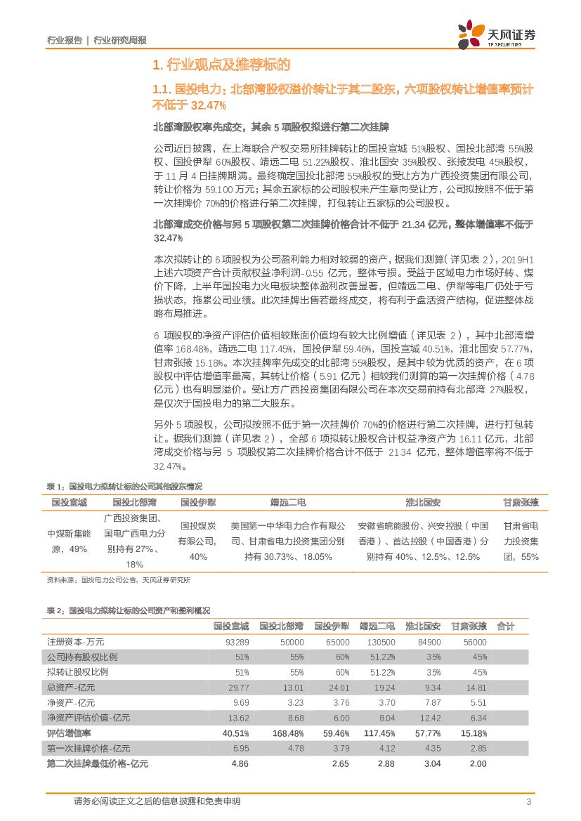 天风证券:公用事业行业研究周报:国投电力出售部分火电资产进展情况:北部湾股权溢价转让于其第二大股东,六项股权转让增值率预计不低于32.47%.pdf