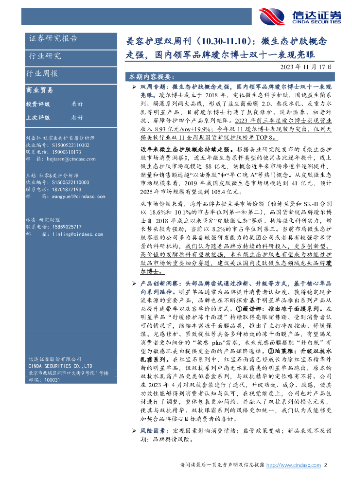 信达证券:美容护理双周刊:微生态护肤概念走强,国内领军品牌瑷尔博士双十一表现亮眼.pdf