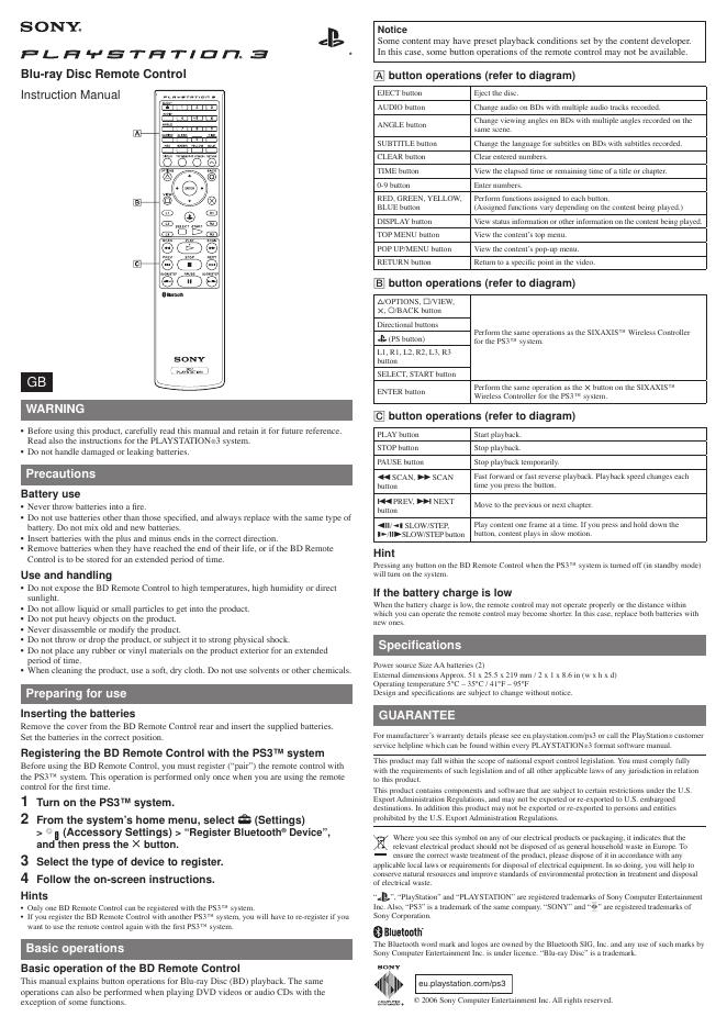 索尼 PS3 Blu-ray Disc Remote Control 使用手册.pdf