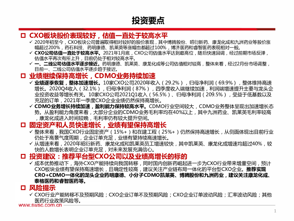 西南证券:CXO板块2020年报及2021Q1季报总结:行业景气度保持高水平,CDMO持续加速.pdf