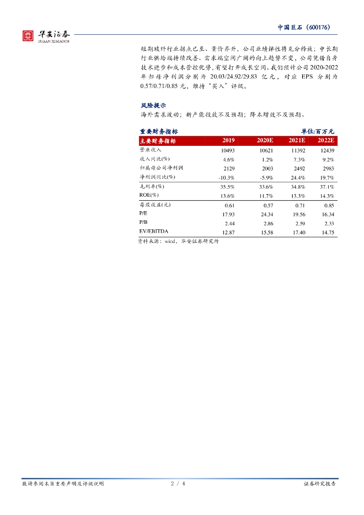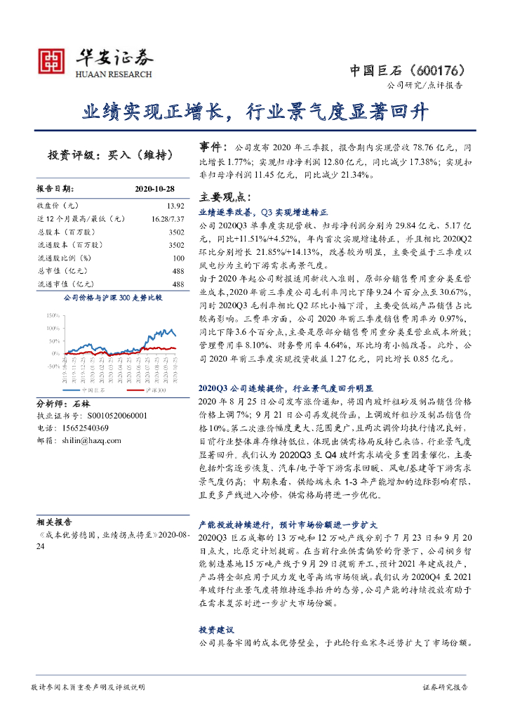 华安证券:中国巨石(600176)-业绩实现正增长,行业景气度显著回升.pdf