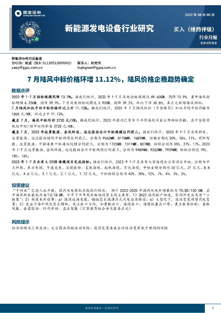 国金证券:新能源发电设备行业研究:7月陆风中标价格环增11.12%,陆风价格企稳趋势确定.pdf