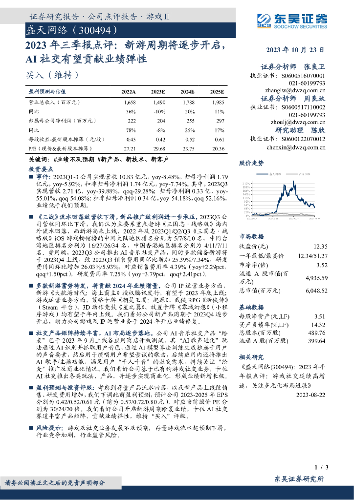 东吴证券:盛天网络(300494)-2023年三季报点评:新游周期将逐步开启,AI社交有望贡献业绩弹性.pdf