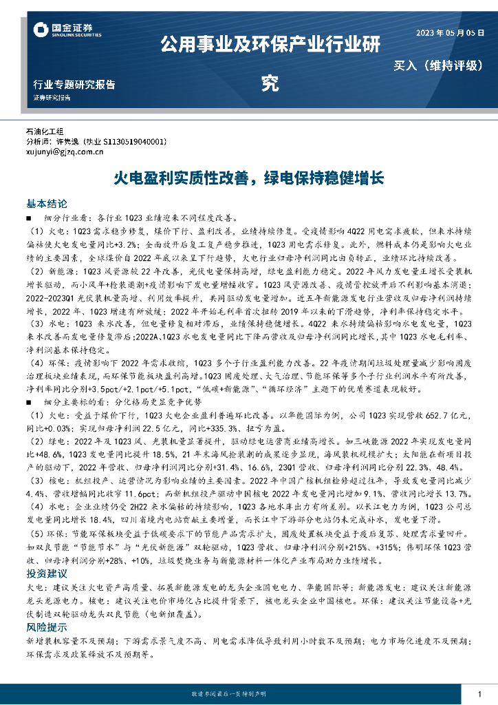 国金证券:公用事业及环保产业行业研究:火电盈利实质性改善,绿电保持稳健增长.pdf