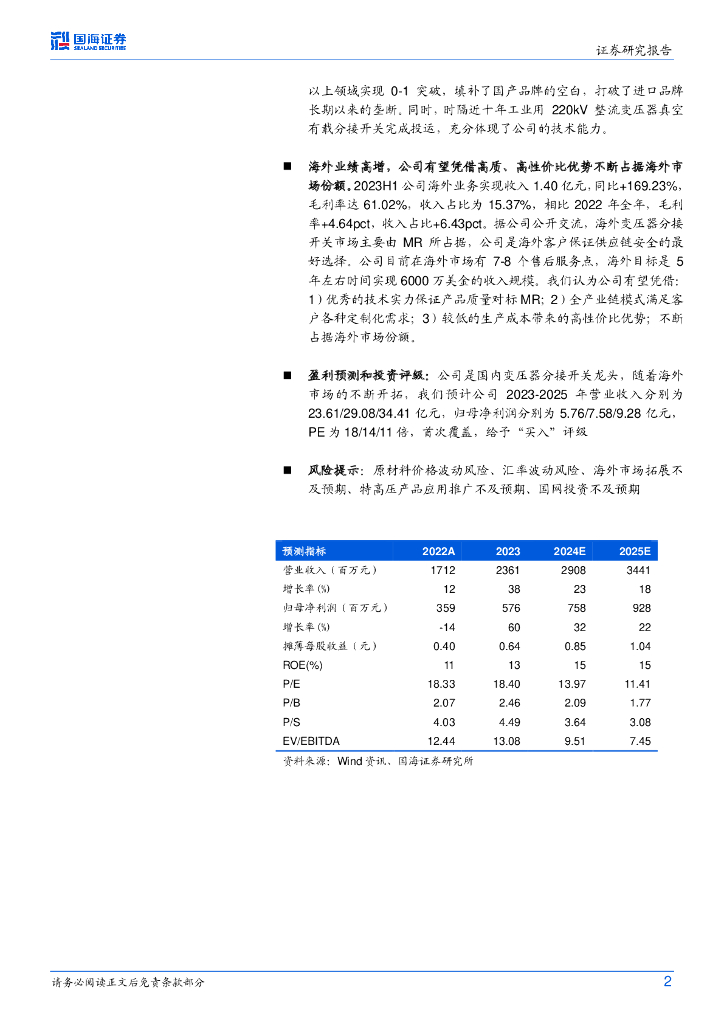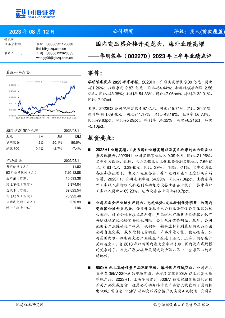 国海证券:华明装备(002270)-2023年上半年业绩点评:国内变压器分接开关龙头,海外业绩高增.pdf