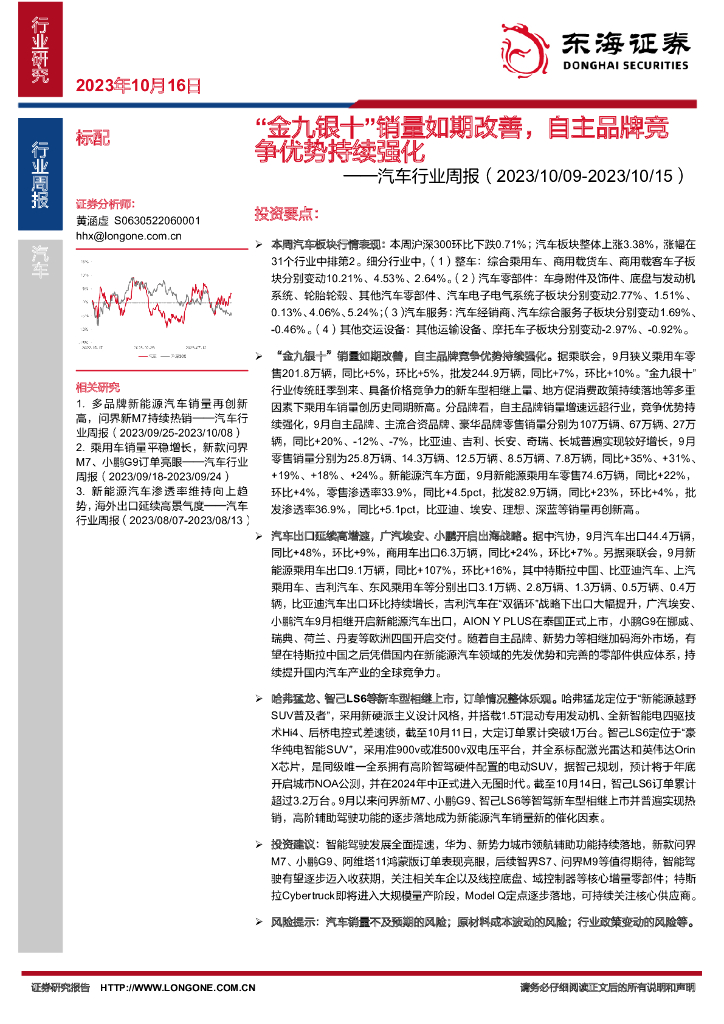 东海证券:汽车行业周报:“金九银十”销量如期改善,自主品牌竞争优势持续强化.pdf