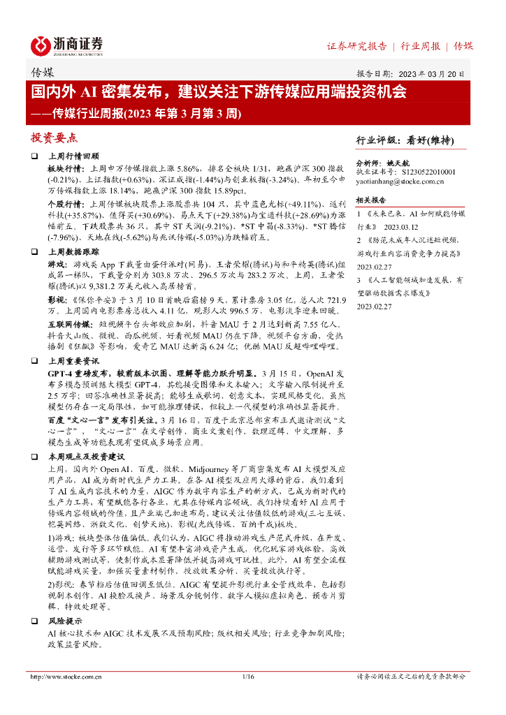 浙商证券:传媒行业周报(2023年第3月第3周):国内外AI密集发布,建议关注下游传媒应用端投资机会.pdf