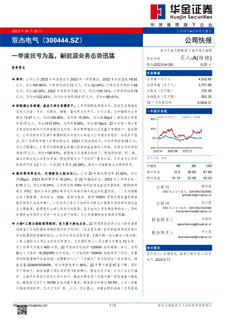 华金证券:双杰电气(300444)-一季度扭亏为盈,新能源业务态势迅猛.pdf
