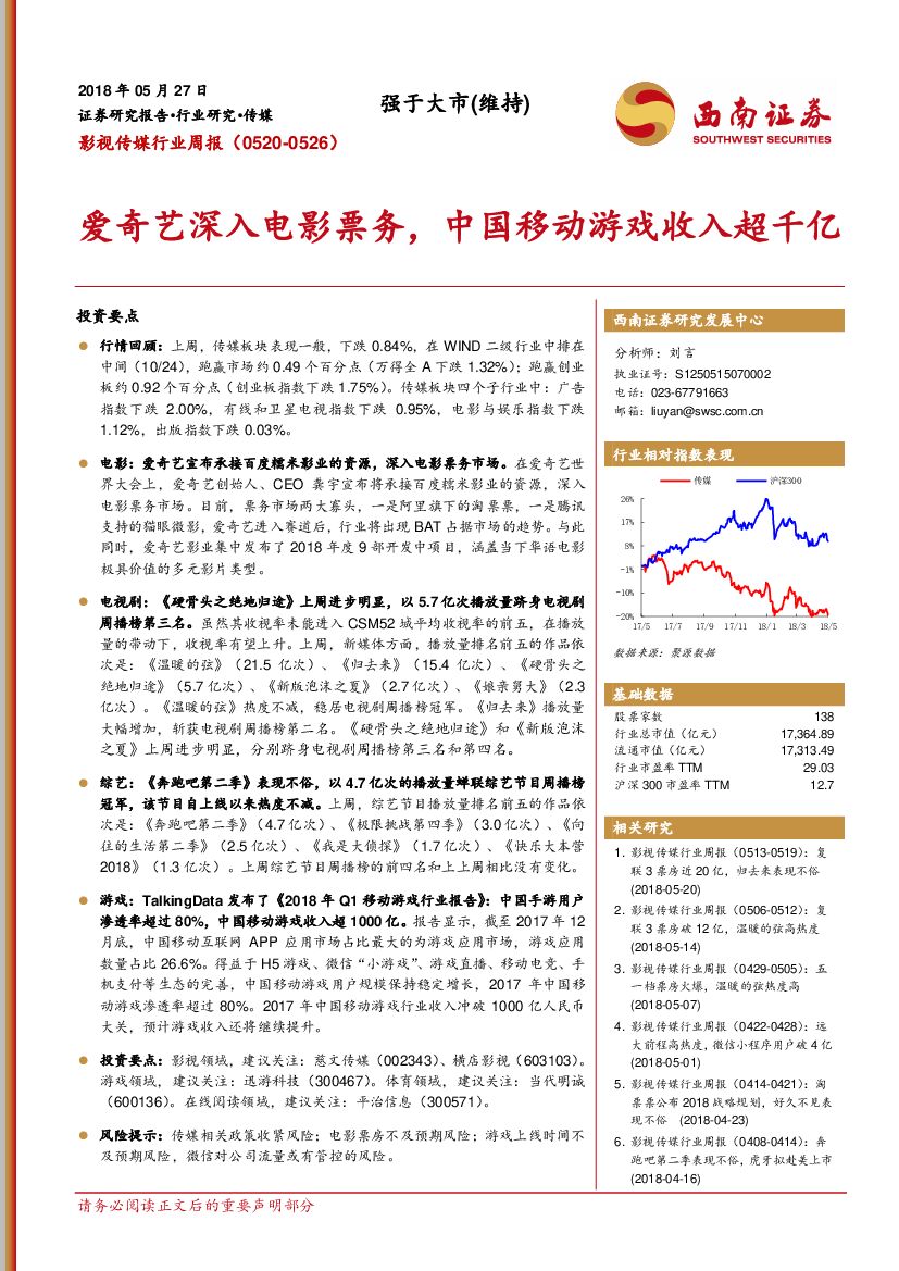 西南证券:影视传媒行业周报:爱奇艺深入电影票务,中国移动游戏收入超千亿.pdf