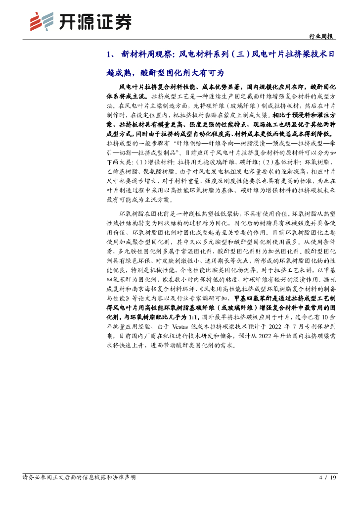 开源证券:新材料行业周报:风电材料系列三:风电叶片拉挤梁技术日趋成熟,酸酐型固化剂大有可为.pdf