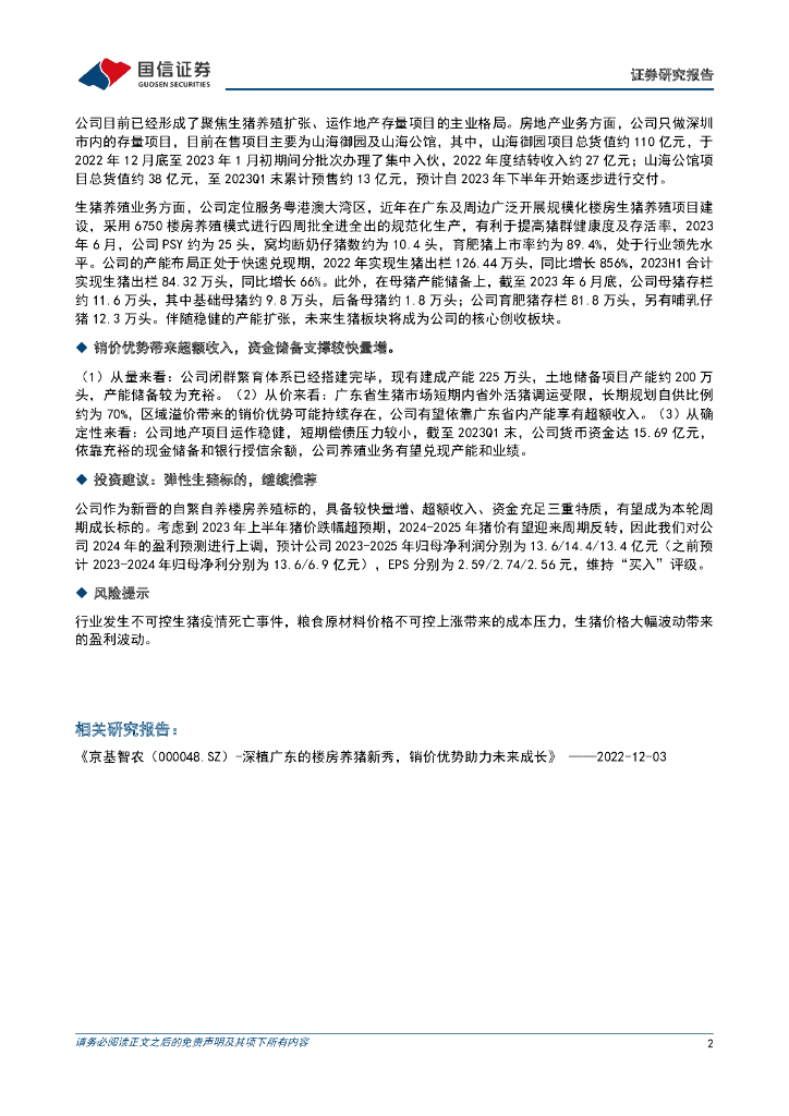 国信证券:京基智农(000048)-2023半年报业绩预告点评:2023Q2归母净利同比扭亏为盈,养殖成本实现稳步下降.pdf