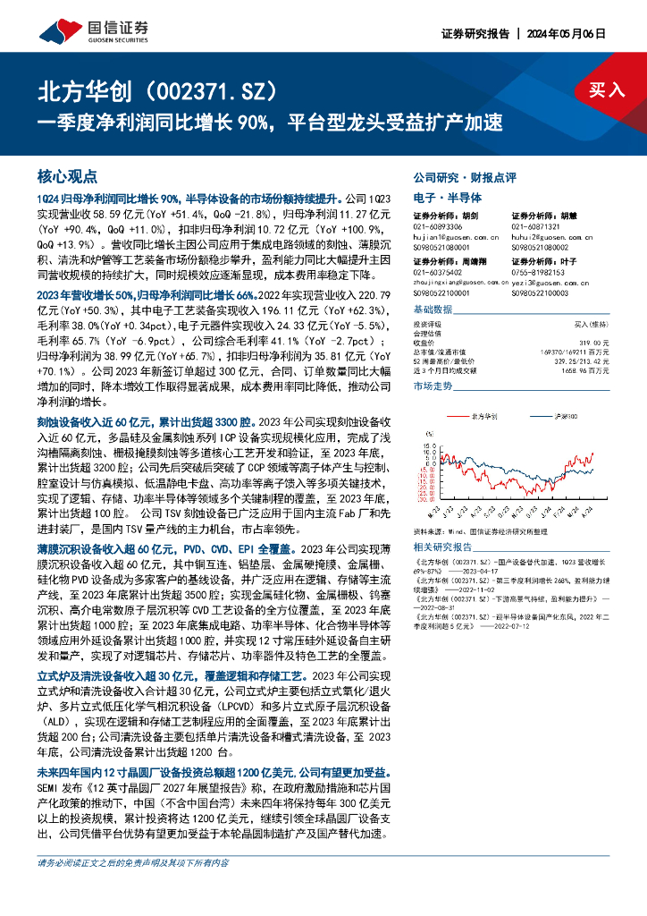 国信证券:北方华创(002371)-一季度净利润同比增长90%,平台型龙头受益扩产加速.pdf