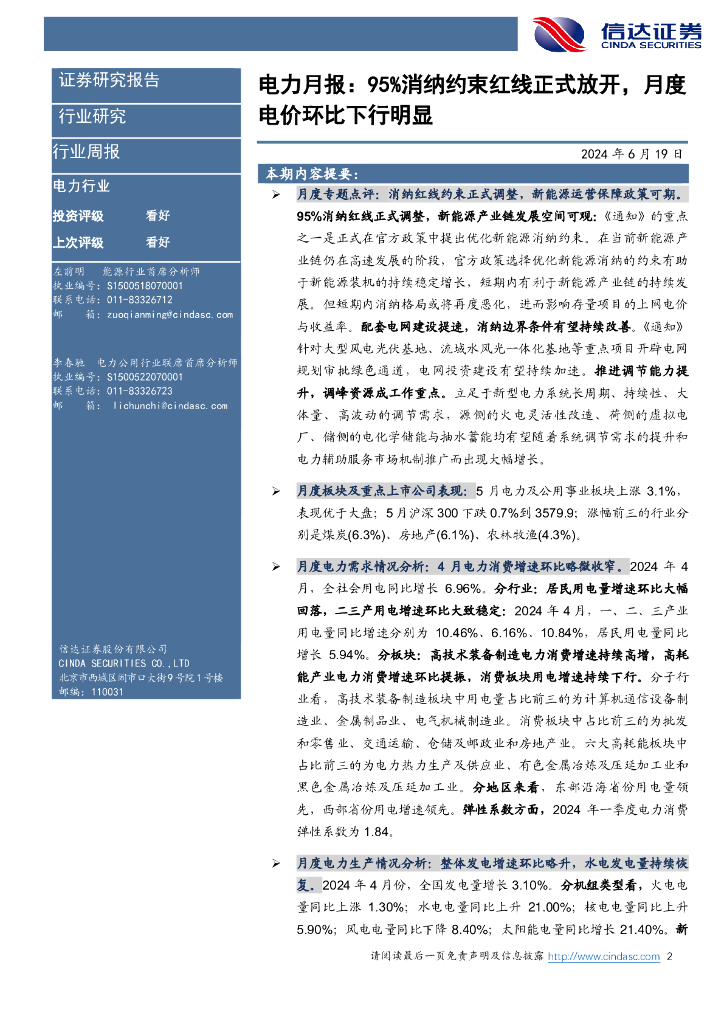 信达证券:95%消纳约束红线正式放开,月度电价环比下行明显—电力行业4月月报.pdf