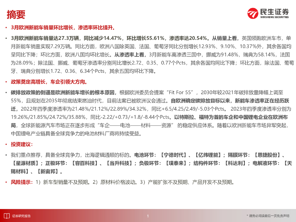 民生证券:EV观察系列161:3月欧洲新能车市场环比增长,渗透率达20.54%.pdf