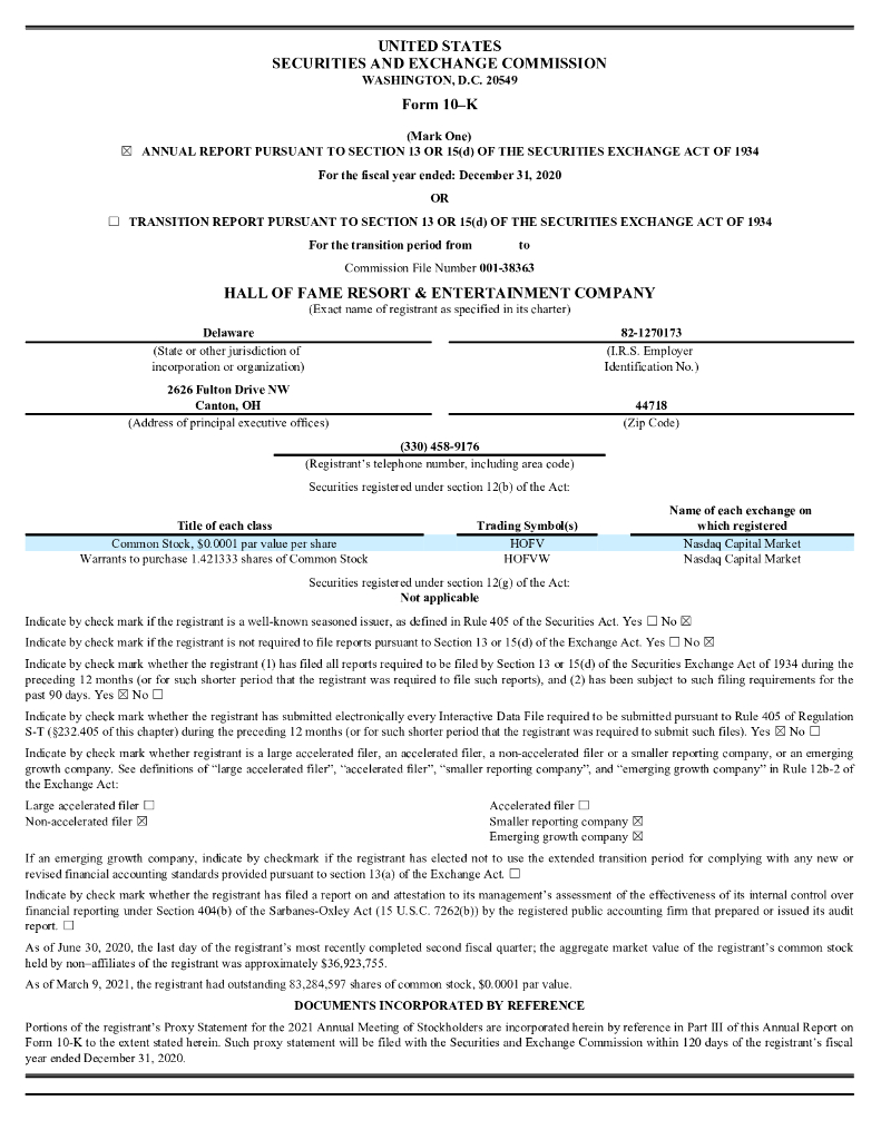 Hall of Fame Resort & Entertainment Company(HOFV)2020财年年度报告(英文版).pdf