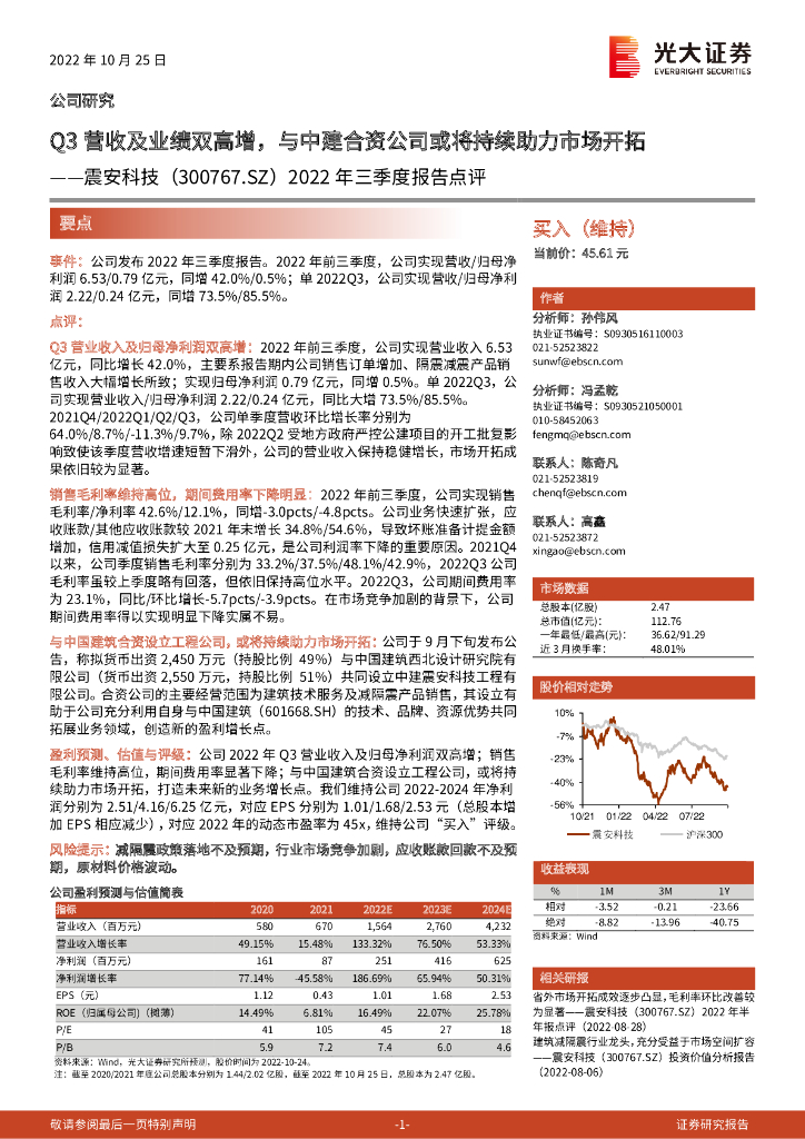光大证券:震安科技(300767)-2022年三季度报告点评:Q3营收及业绩双高增,与中建合资公司或将持续助力市场开拓.pdf