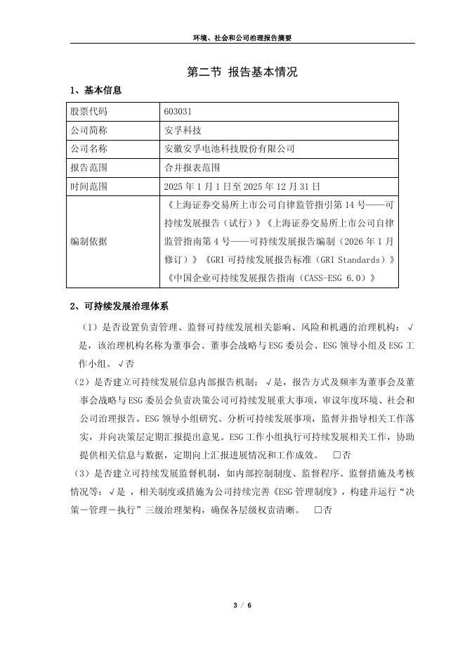 603031-安孚科技:安徽安孚电池科技股份有限公司2025年度环境、社会和公司治理报告摘要.pdf