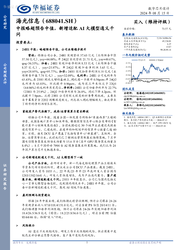 华福证券:海光信息(688041)-中报略超预告中值,新增适配AI大模型通义千问.pdf
