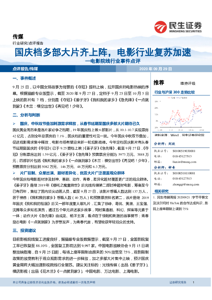 民生证券:传媒行业:电影院线行业事件点评:国庆档多部大片齐上阵,电影行业复苏加速.pdf