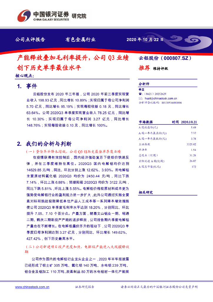 中国银河:云铝股份(000807)-产能释放叠加毛利率提升,公司Q3业绩创下历史单季最佳水平.pdf