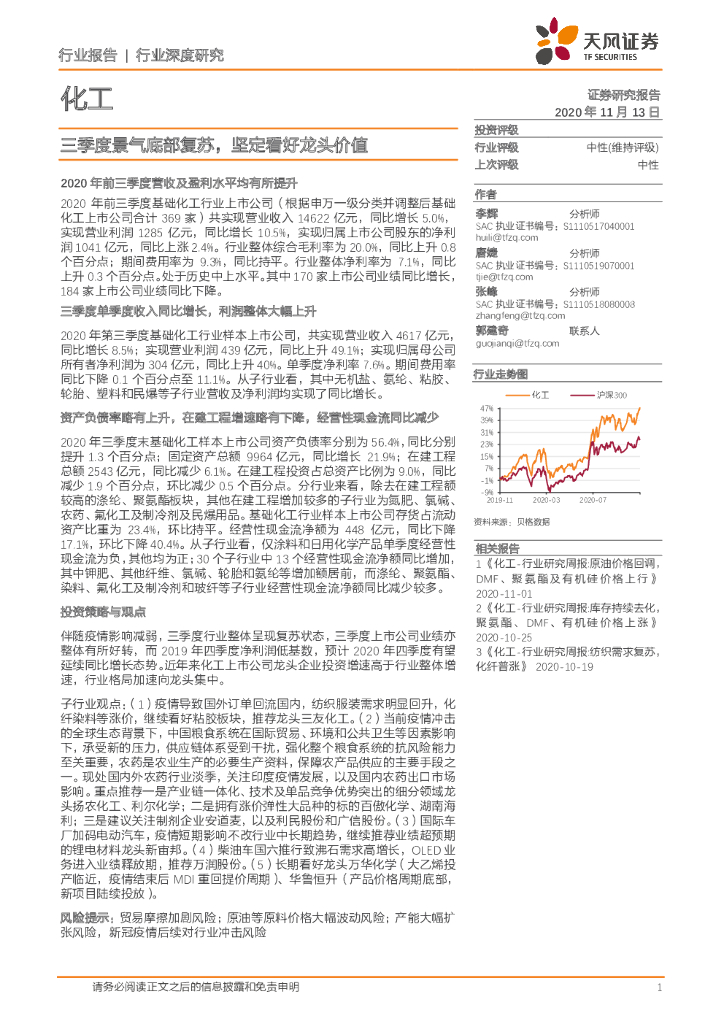 天风证券:化工:三季度景气底部复苏,坚定看好龙头价值.pdf