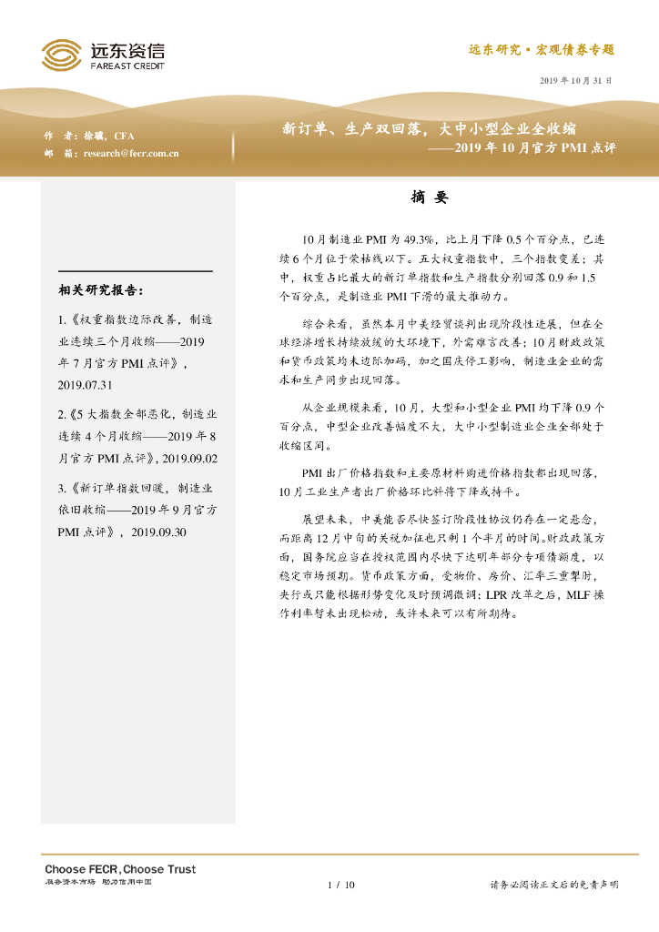 远东资信:新订单、生产双回落,大中小型企业全收缩——2019年10月官方PMI点评.pdf