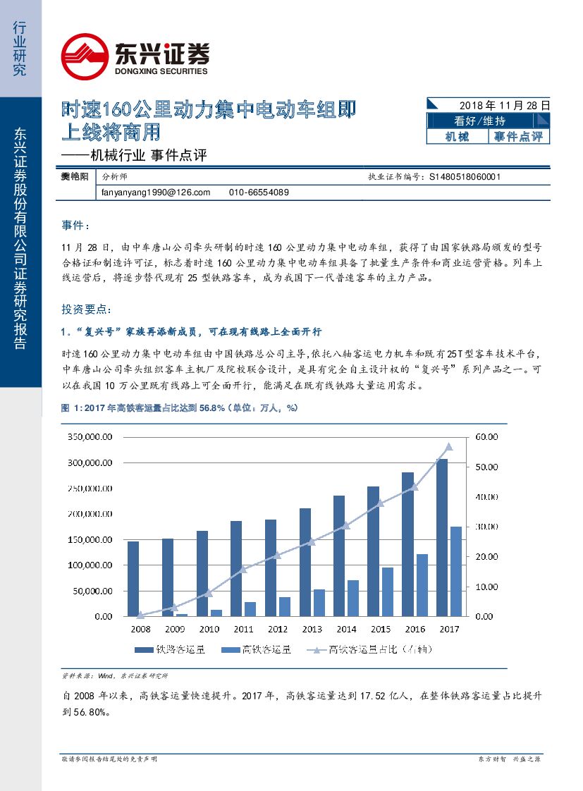 东兴证券:机械行业事件点评:时速160公里动力集中电动车组即上线将商用.pdf