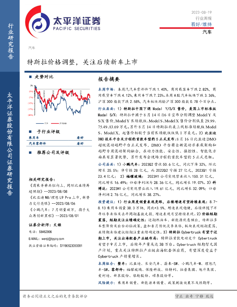 太平洋证券:汽车行业周报:特斯拉价格调整,关注后续新车上市.pdf
