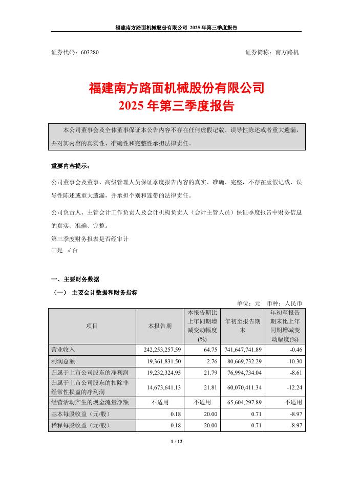 603280-南方路机:南方路机2025年第三季度报告.pdf