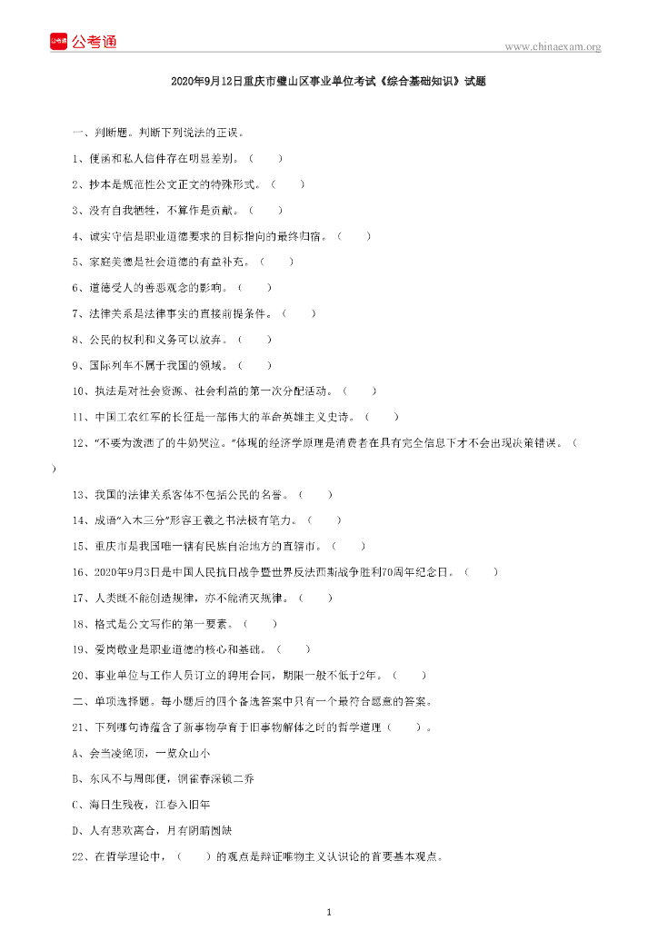 2020年9月12日重庆市璧山区事业单位考试《综合基础知识》试题.pdf