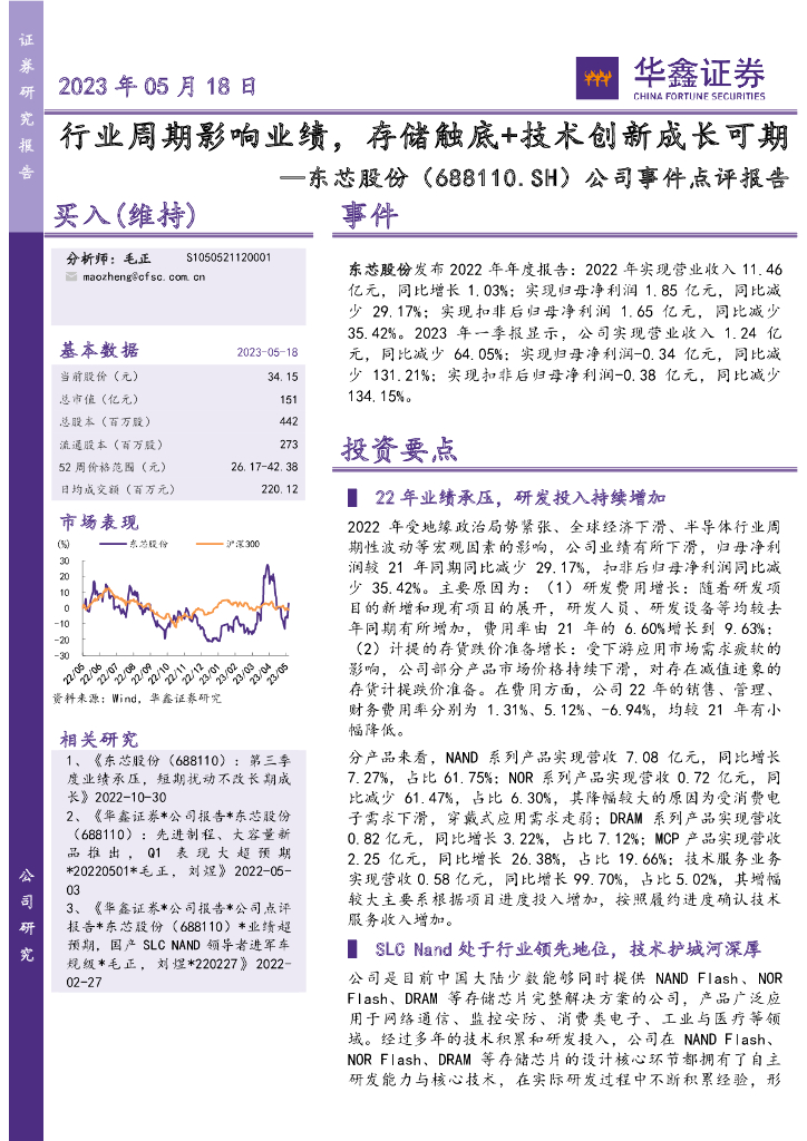 华鑫证券:东芯股份(688110)-公司事件点评报告:行业周期影响业绩,存储触底+技术创新成长可期.pdf