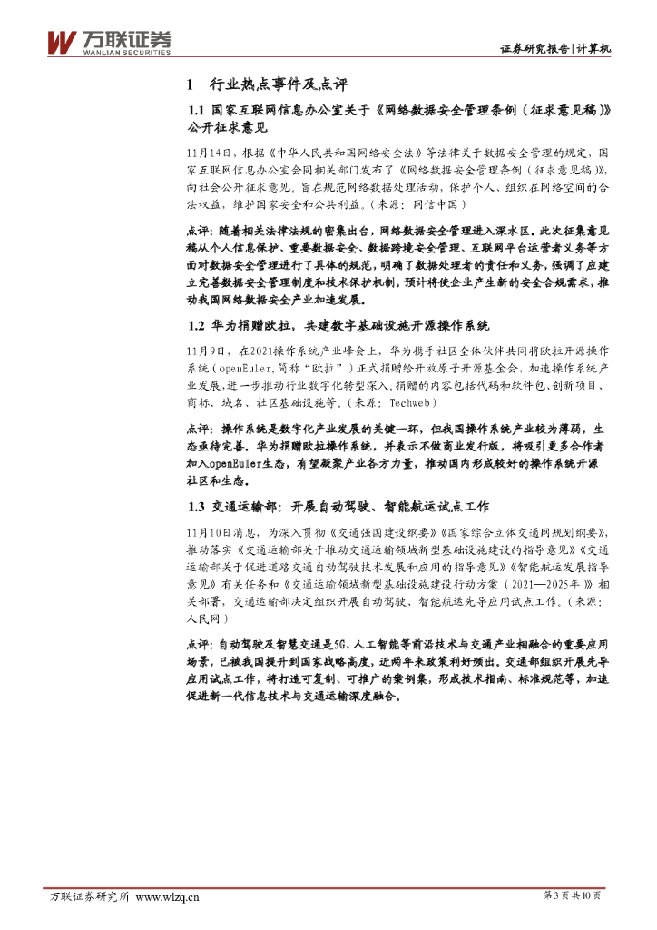 万联证券:计算机行业周观点:网络数据安全管理条例公开征求意见,华为捐赠欧拉开源操作系统.pdf