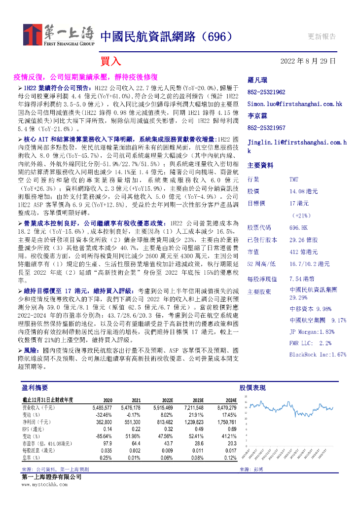 第一上海证券:中国民航信息网络(00696)港股公司研究报告-疫情反复,公司短期业绩承压,静待疫后修复.pdf