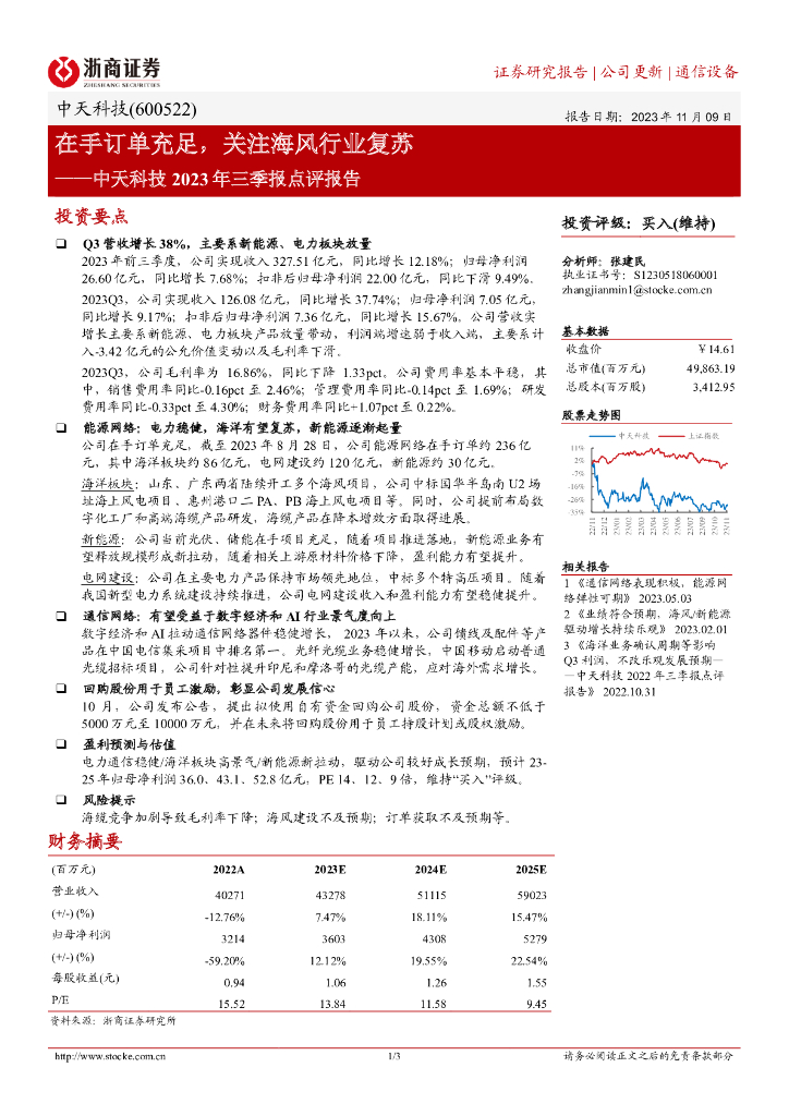 浙商证券:中天科技2023年三季报点评报告:在手订单充足,关注海风行业复苏.pdf
