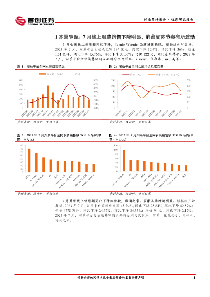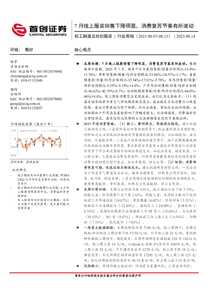 首创证券:轻工制造及纺织服装行业周报:7月线上服装销售下降明显,消费复苏节奏有所波动.pdf