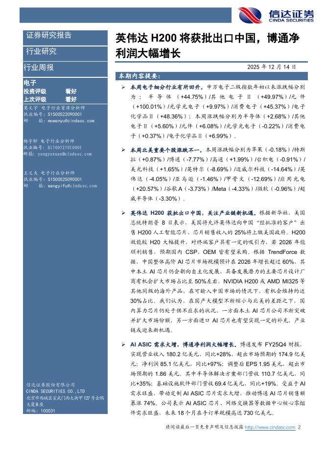 信达证券:电子行业周报:英伟达H200将获批出口中国,博通净利润大幅增长.pdf