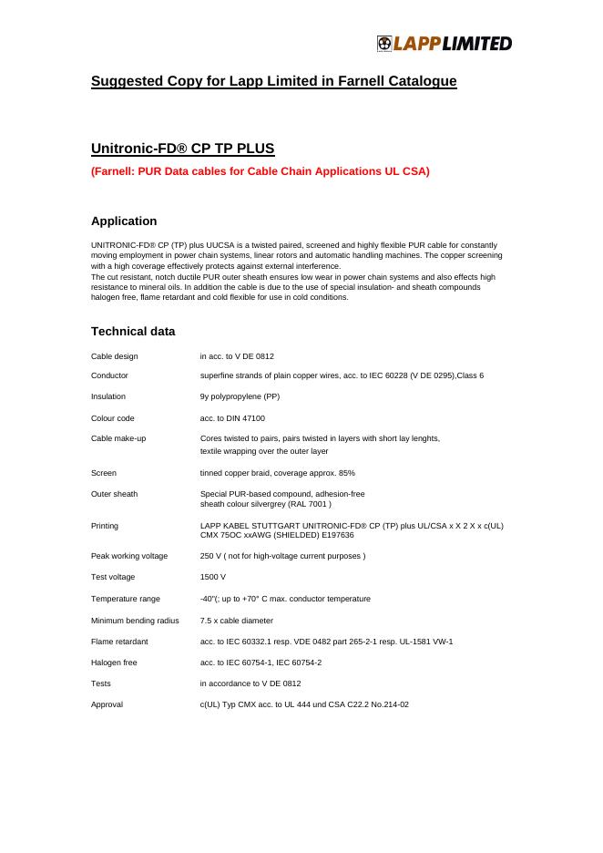 LAPP KABEL Suggested Copy for Lapp Limited in Farnell Catalogue Unitronic-FD® CP TP PLUS (Farnell: PUR Data cables for Cable Chain Applications UL CSA) 数据手册.pdf