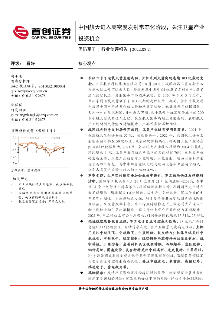 首创证券:国防军工行业简评报告:中国航天进入高密度发射常态化阶段,关注卫星产业投资机会.pdf