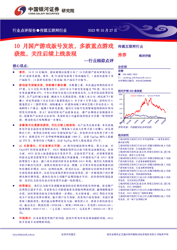 中国银河:传媒互联网行业:10月国产游戏版号发放,多款重点游戏获批,关注后续上线表现.pdf