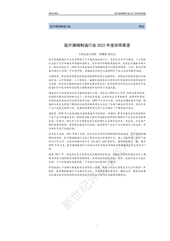 新世纪评级:医疗器械制造行业2022年度信用展望.pdf