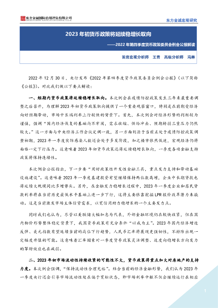 东方金诚: 2022年第四季度货币政策委员会例会公报解读-2023年初货币政策将延续稳增长取向.pdf
