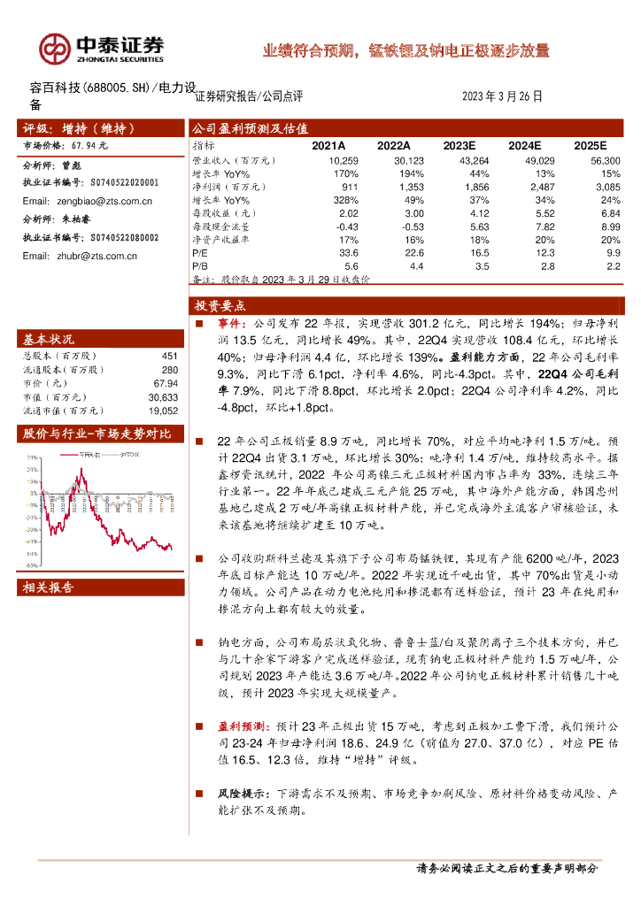 中泰证券:容百科技(688005)-业绩符合预期,锰铁锂及钠电正极逐步放量.pdf