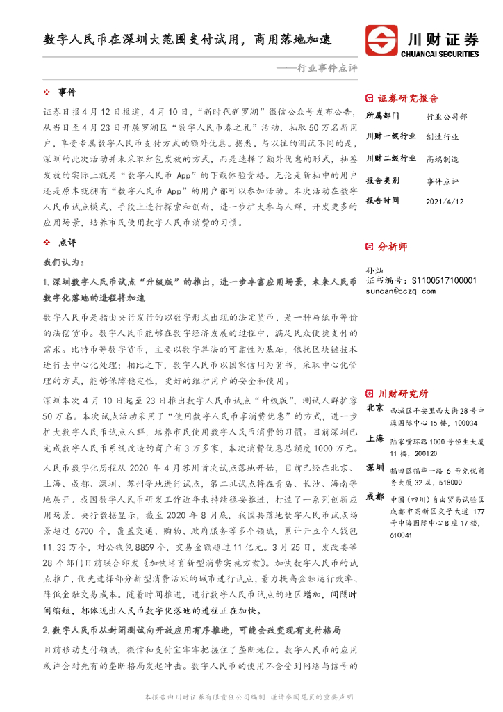 川财证券:高端制造行业事件点评:数字人民币在深圳大范围支付试用,商用落地加速.pdf